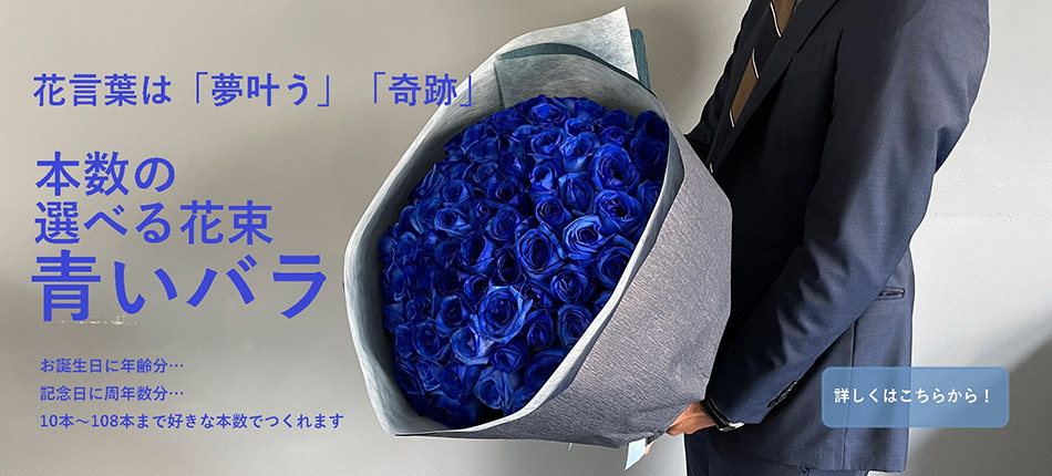 花言葉は「夢叶う」「奇跡」古代から希少な色素と言われている”青”薔薇の108本の花束は目を奪われるほどの美しく迫力があります。