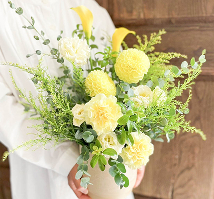 明るいお花の色に思わず目が惹かれる、そのまま飾れるアレンジメントです。花瓶の水替えが不要なため、贈る相手様にお手間をかけさせずにお花を楽しんでいただけます。