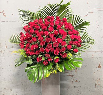 バラを約100本使用しているので、見応え抜群!バラが好きな方へ・お似合いの方へ、贈って頂きたいお花です。洗練されたデザインがバラを一層格上げする、ジンクタイプのスタンドバスケット。法人様の企業祝や、上場祝などにもおすすめです。