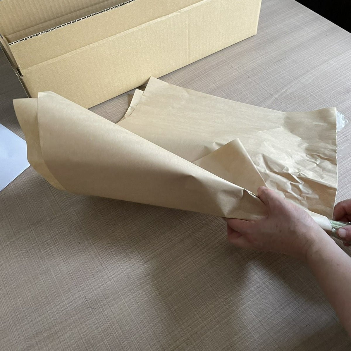 花束はラッピングしてお包みしたお花束を梱包しております。アレンジメントはセロハンで包装しております。ご到着の段ボールから取り出して、すぐにご利用頂ける状態になっております。