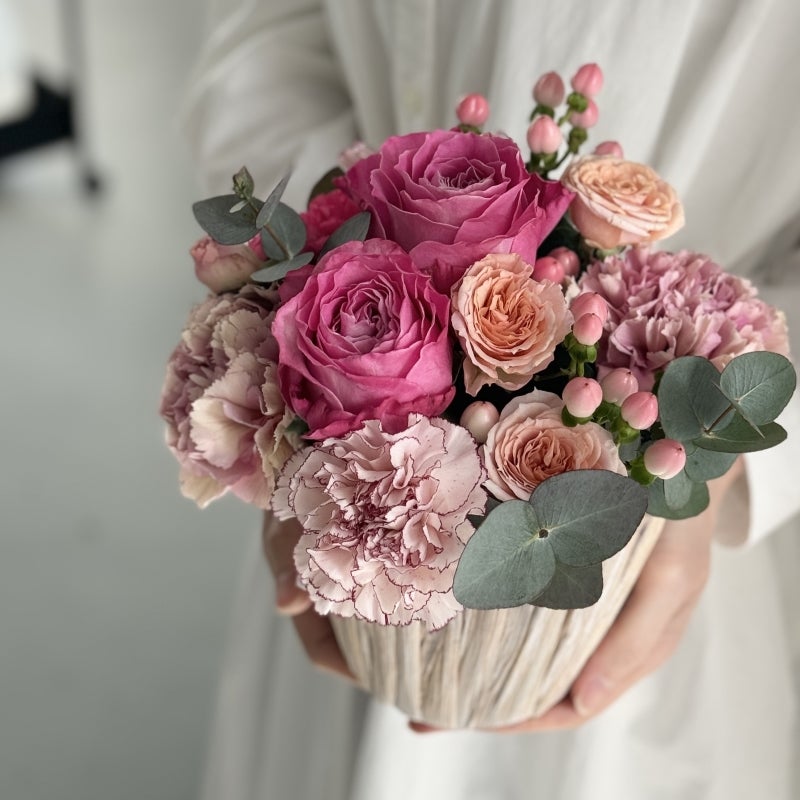 大輪の香りの良いバラをあしらい、存在感たっぷりのバラとニュアンスカラーのスプレーバラとカーネーションの組み合わせが美しいアレンジメント。