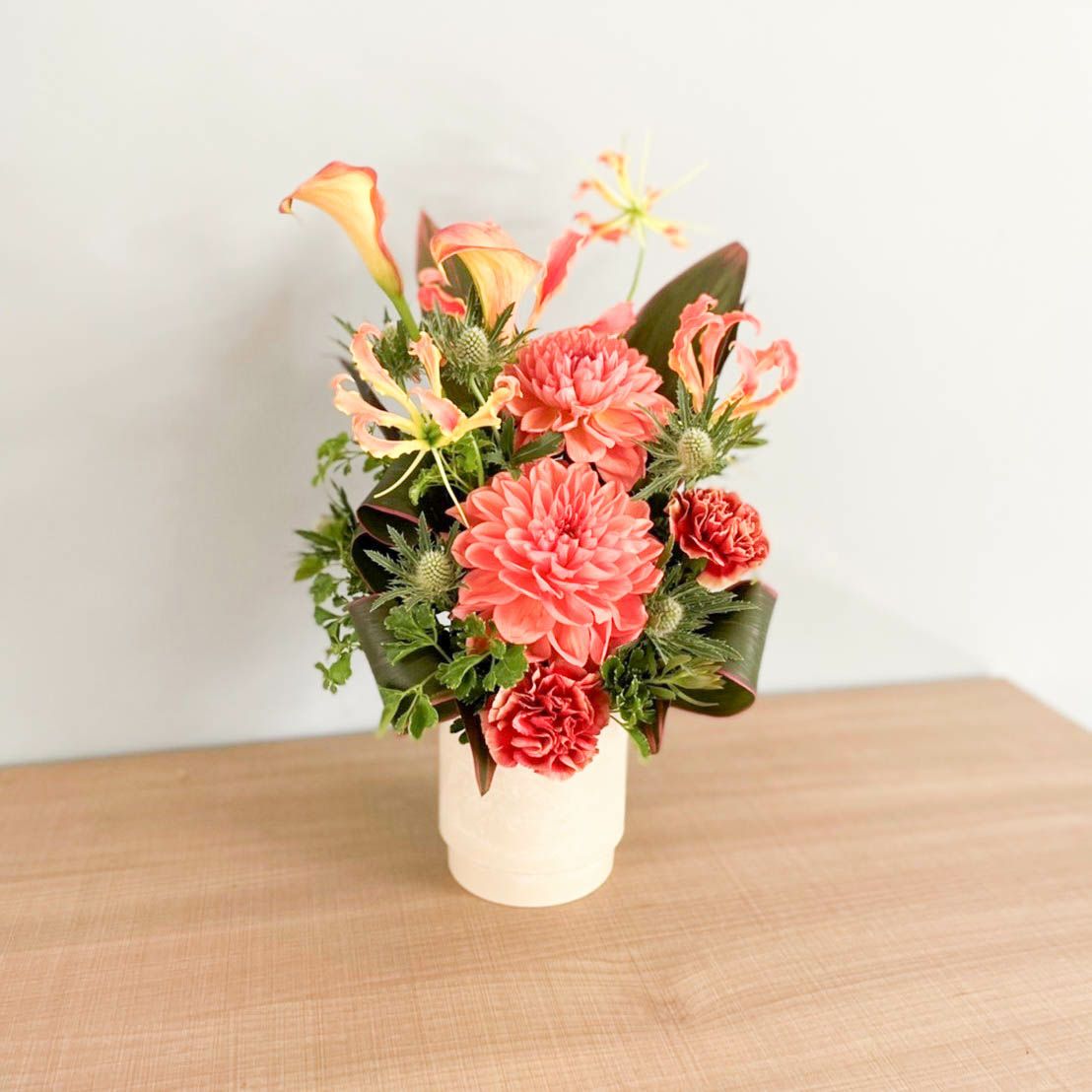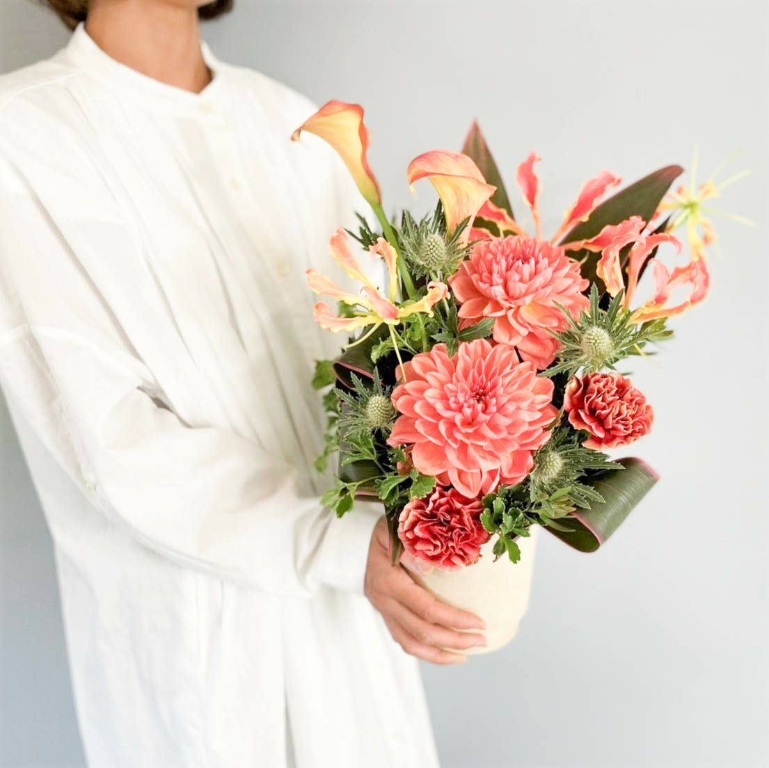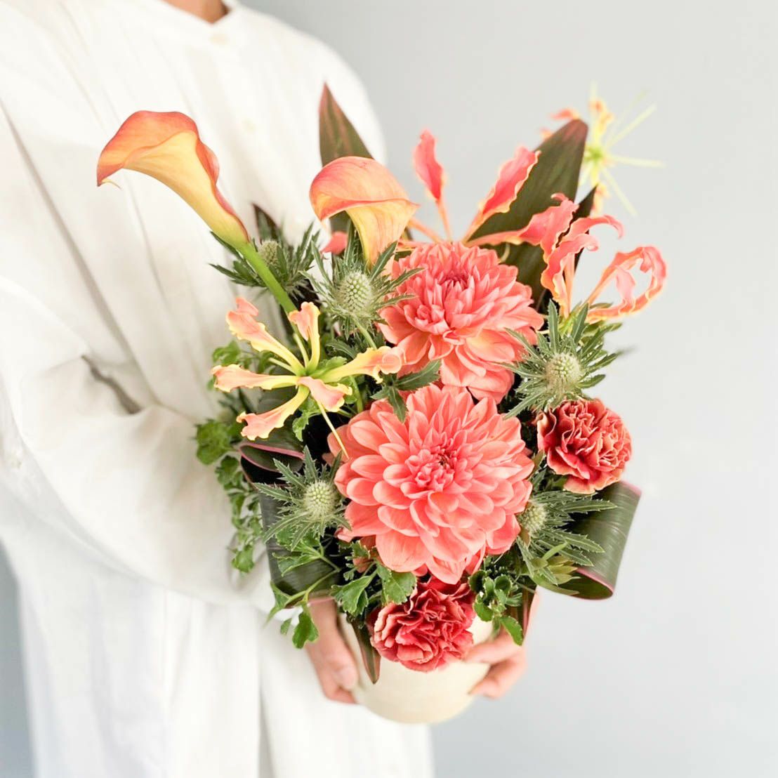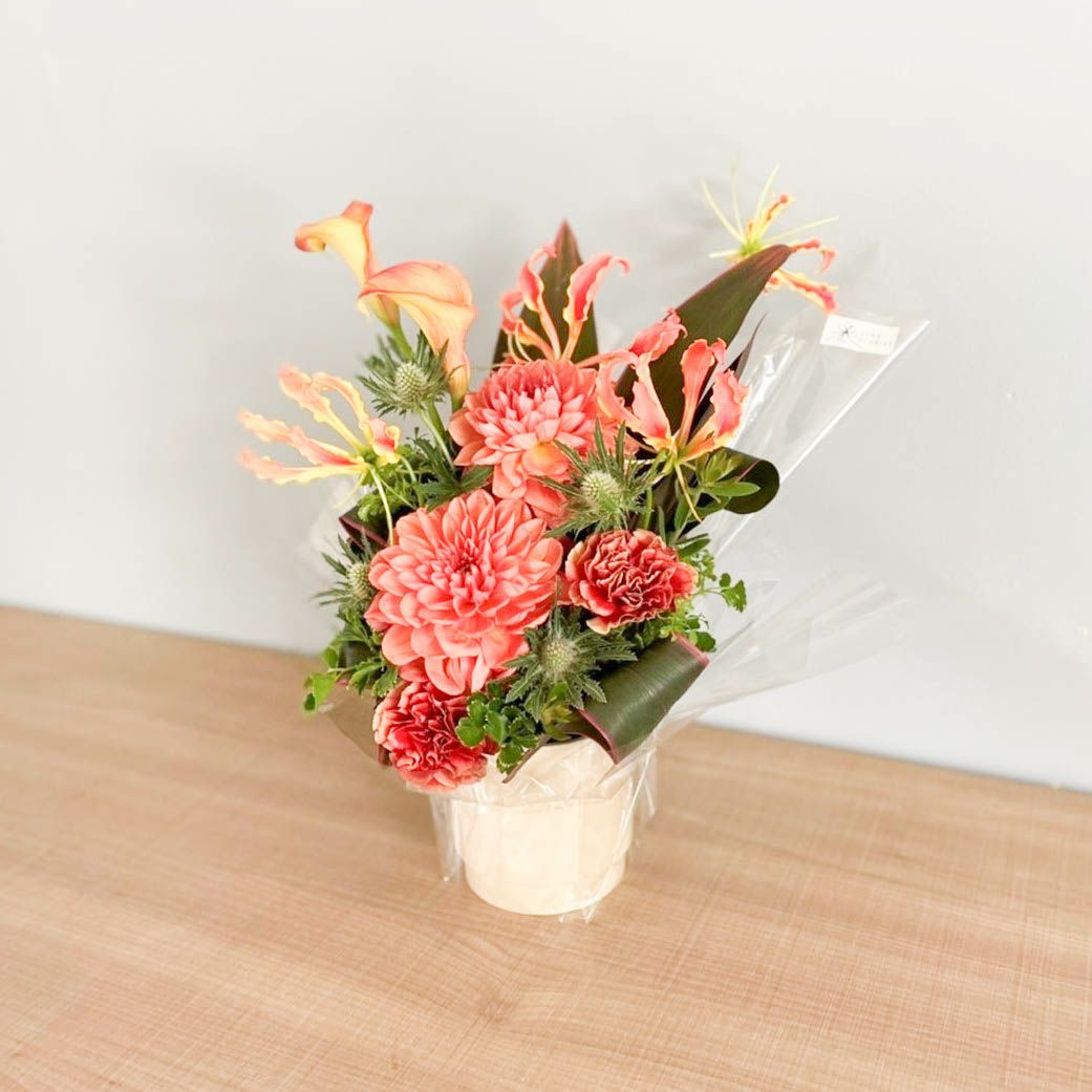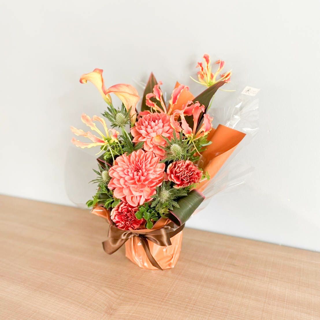 花束はラッピングしてお包みしたお花束を梱包しております。アレンジメントはセロハンで包装しております。ご到着の段ボールから取り出して、すぐにご利用頂ける状態になっております。