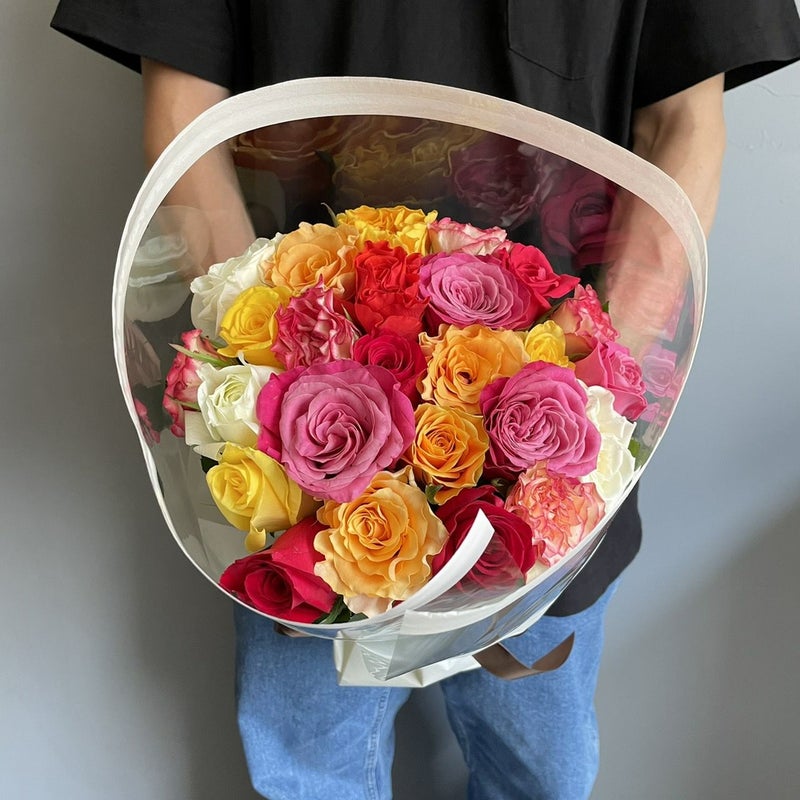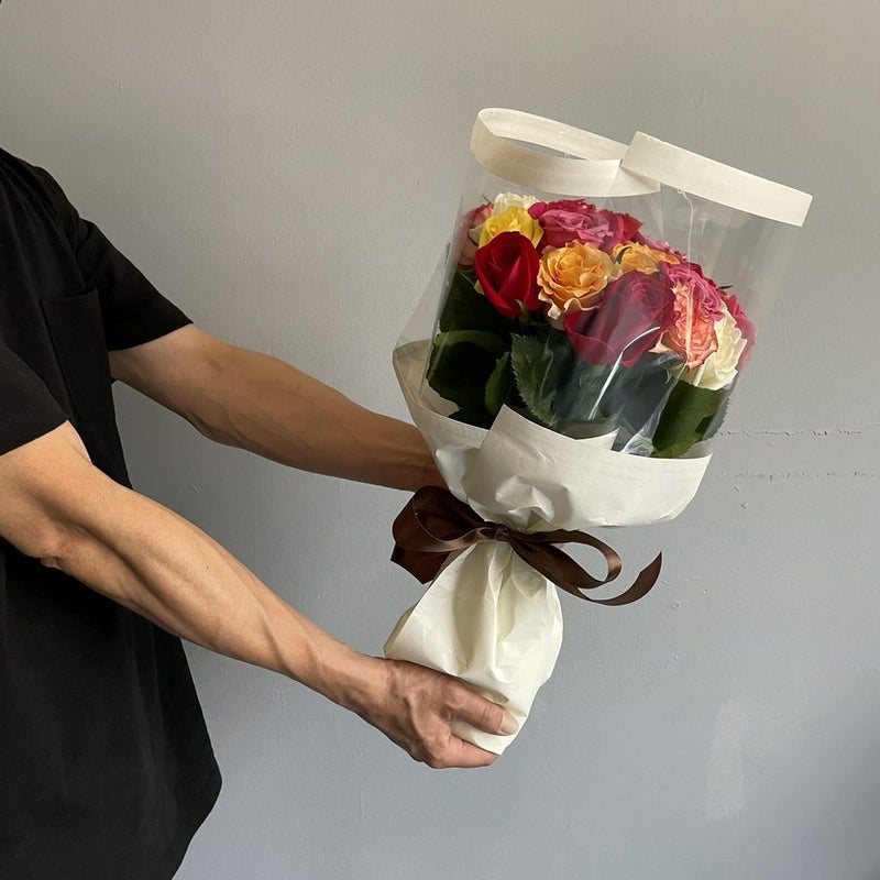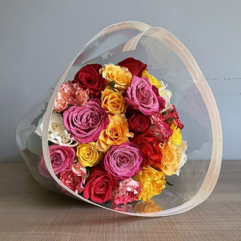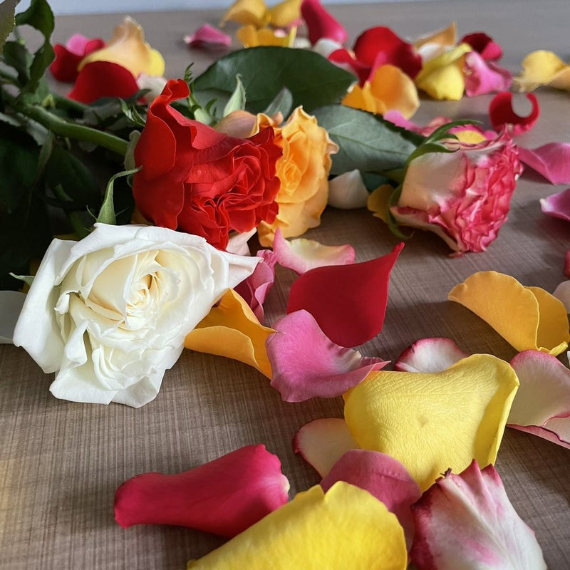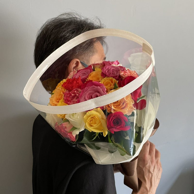・花束の写真はイメージです。生バラのため、色味などは写真と異なる場合もございます。はっきりとした色あいのおまかせのMIX花束です。