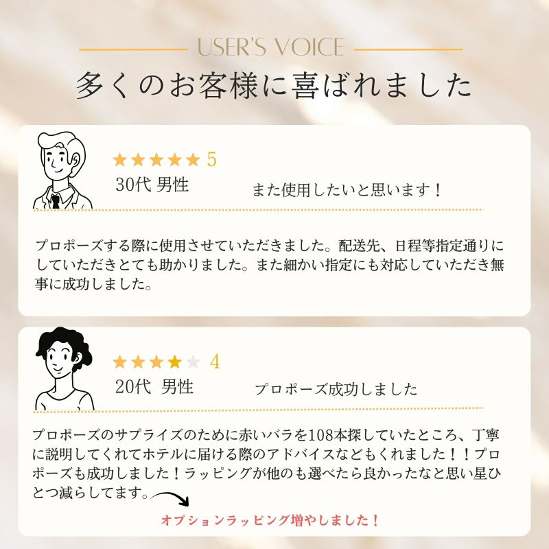 108本のバラの花束には「結婚してください」という意味が込められてます。108が「永遠(とわ)」と読める語呂合わせから由来しております。プロポーズの薔薇の花束は当店でも1番人気で、永遠の愛を誓うプロポーズに圧倒的おすすめです。