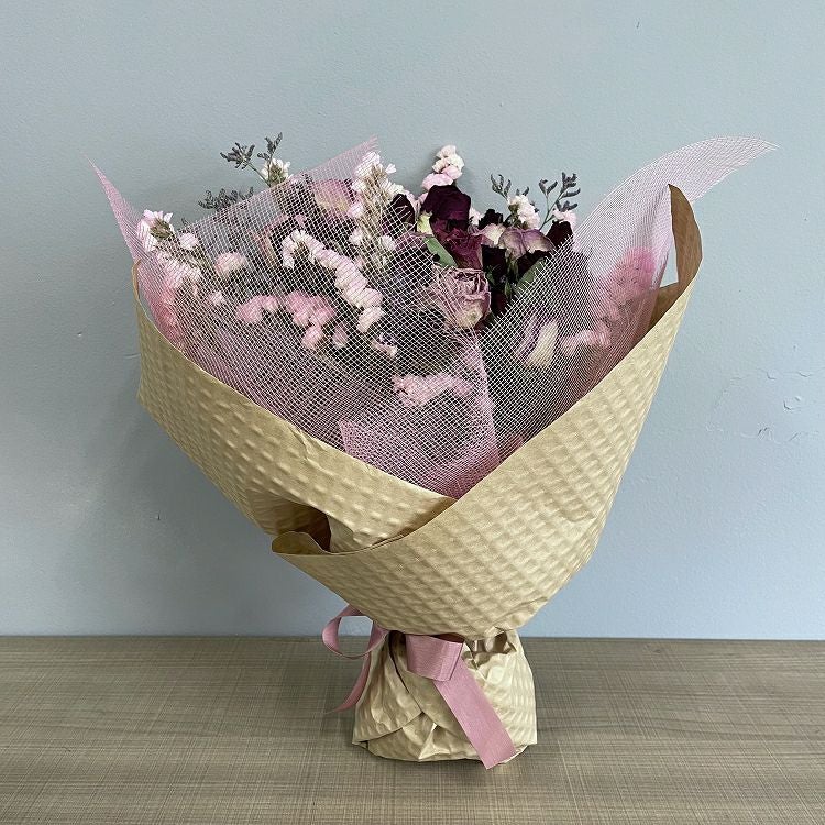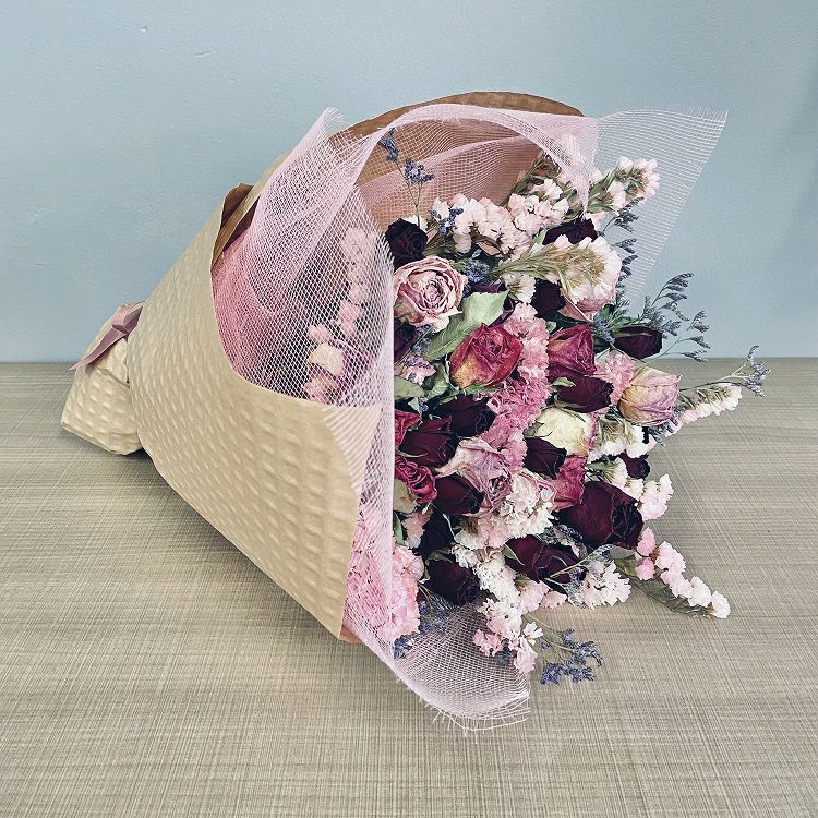 花束はラッピングしてお包みしたお花束を梱包しております。アレンジメントはセロハンで包装しております。ご到着の段ボールから取り出して、すぐにご利用頂ける状態になっております。