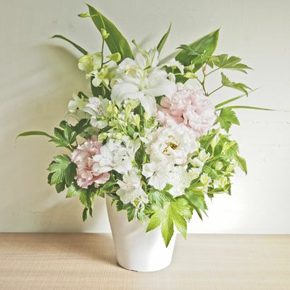 季節の緑も一緒にアレンジし、やわらかな雰囲気に仕上げます。