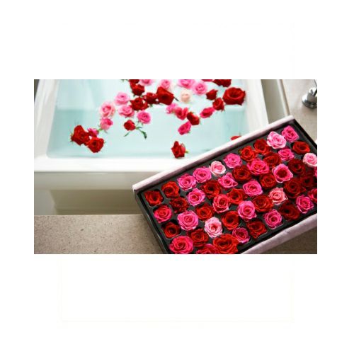 女性にとって憧れの時間...バラに彩られたバスタイムを楽しめます。日常から解き放たれて最高のシーンを贈り物にしてみてはいかがですか。きっと思い出に残るリラクゼーションになるはずです。ケースひとつずつ収められたバラは、まるで高級なチョコレートやマカロンのようにみえるかも