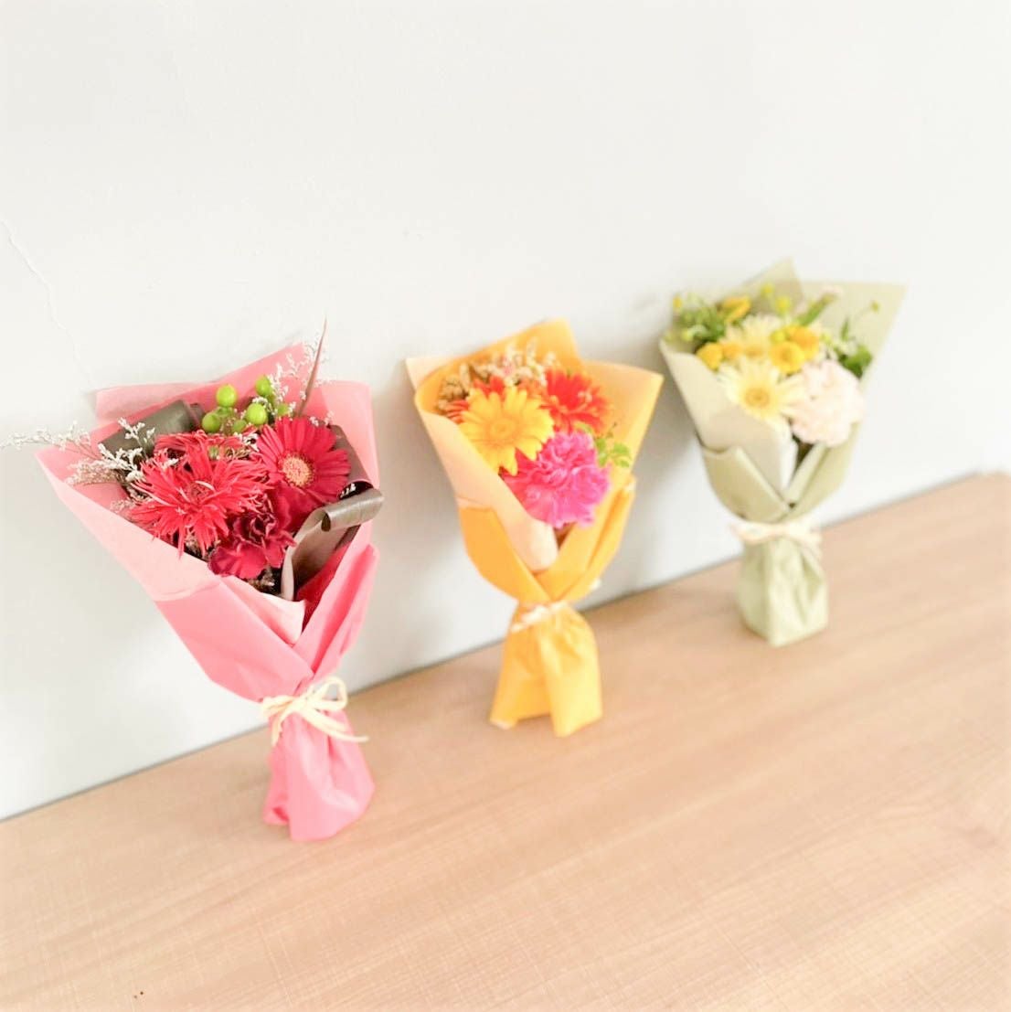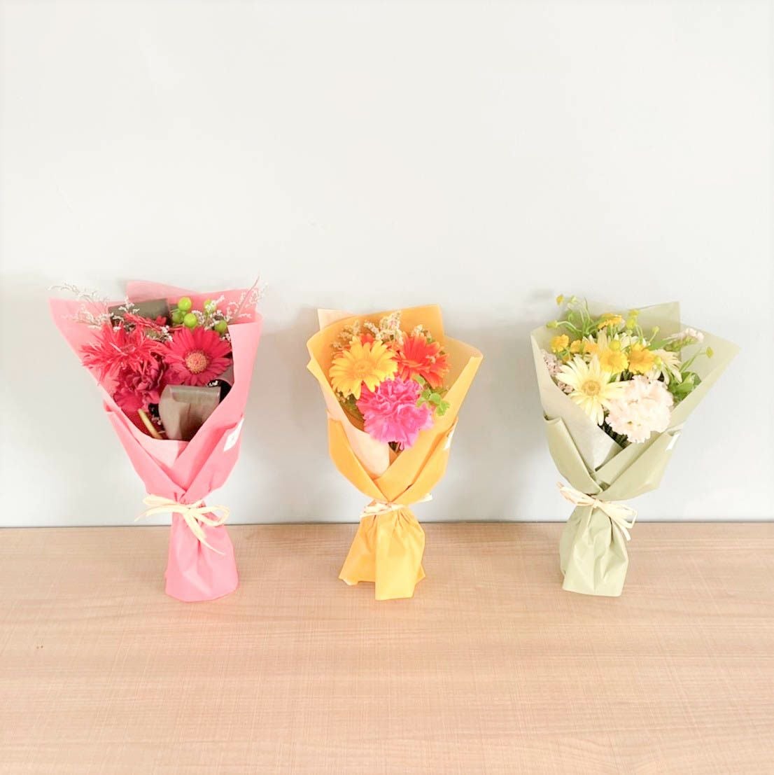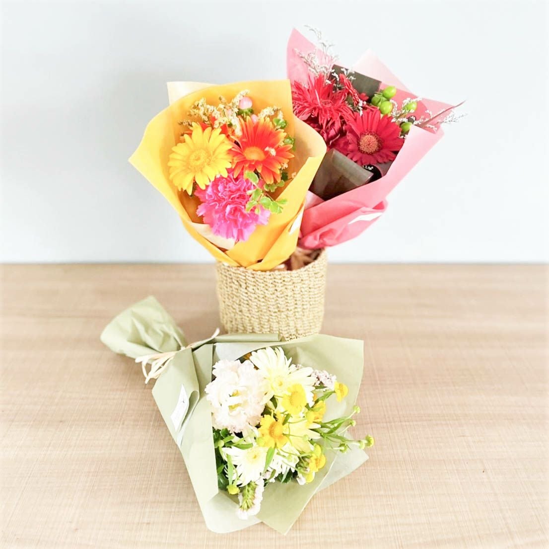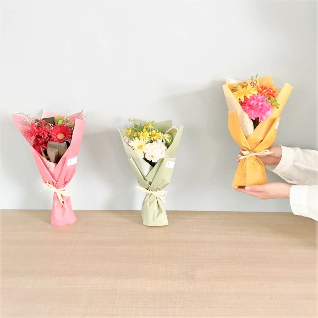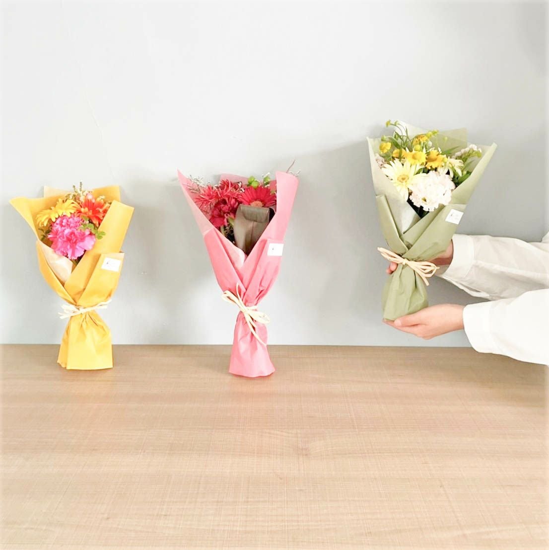 花束はラッピングしてお包みしたお花束を梱包しております。アレンジメントはセロハンで包装しております。ご到着の段ボールから取り出して、すぐにご利用頂ける状態になっております。
