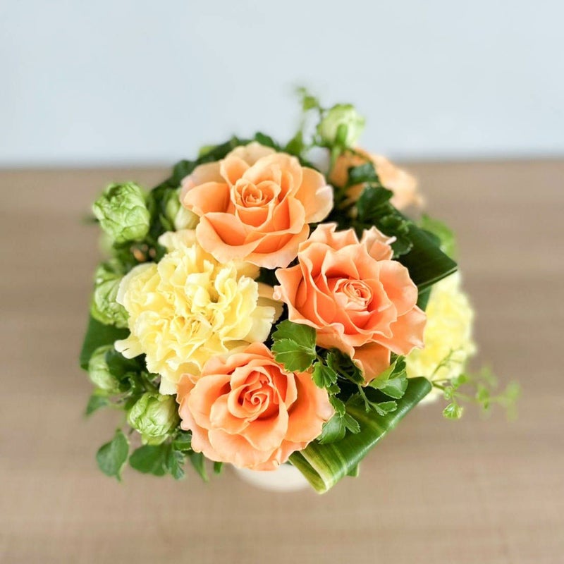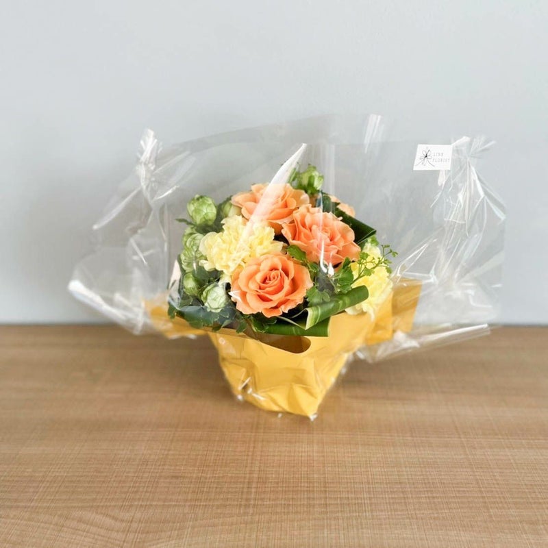 花束はラッピングしてお包みしたお花束を梱包しております。アレンジメントはセロハンで包装しております。ご到着の段ボールから取り出して、すぐにご利用頂ける状態になっております。