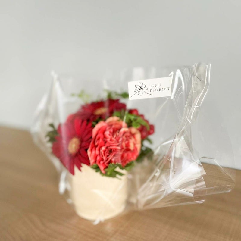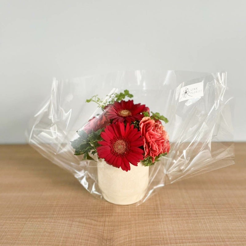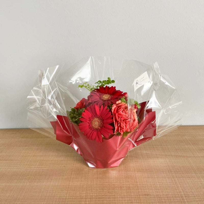 花束はラッピングしてお包みしたお花束を梱包しております。アレンジメントはセロハンで包装しております。ご到着の段ボールから取り出して、すぐにご利用頂ける状態になっております。