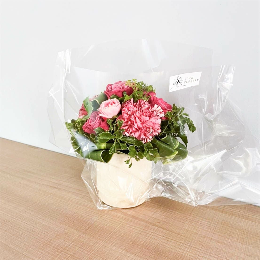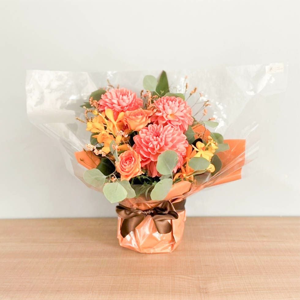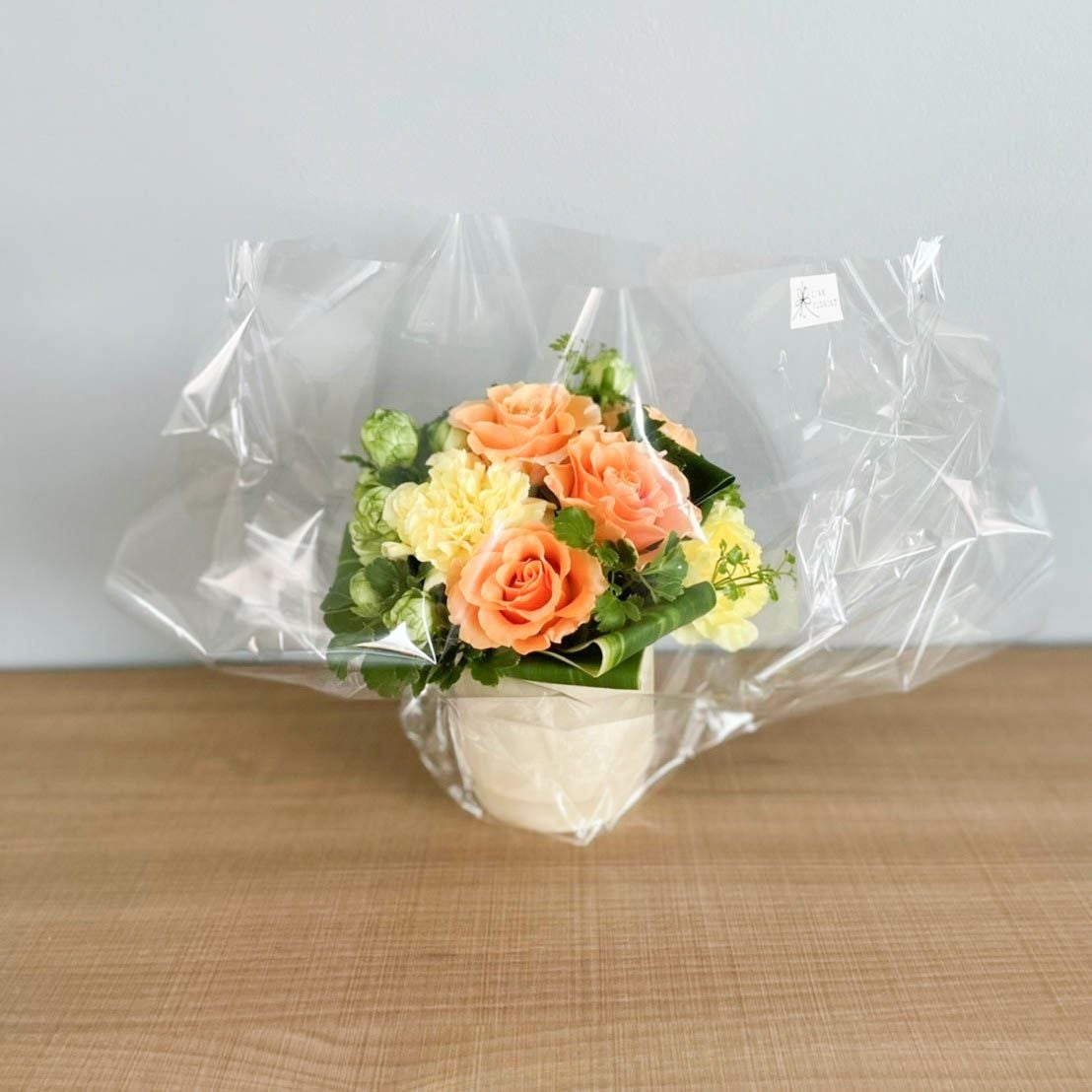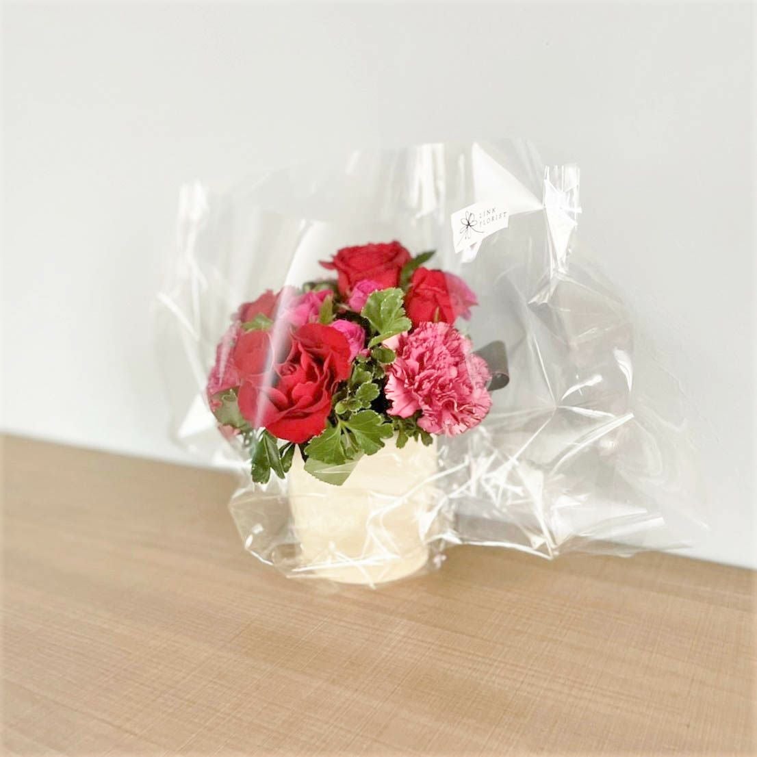 花束はラッピングしてお包みしたお花束を梱包しております。アレンジメントはセロハンで包装しております。ご到着の段ボールから取り出して、すぐにご利用頂ける状態になっております。