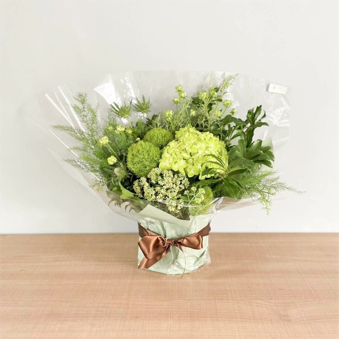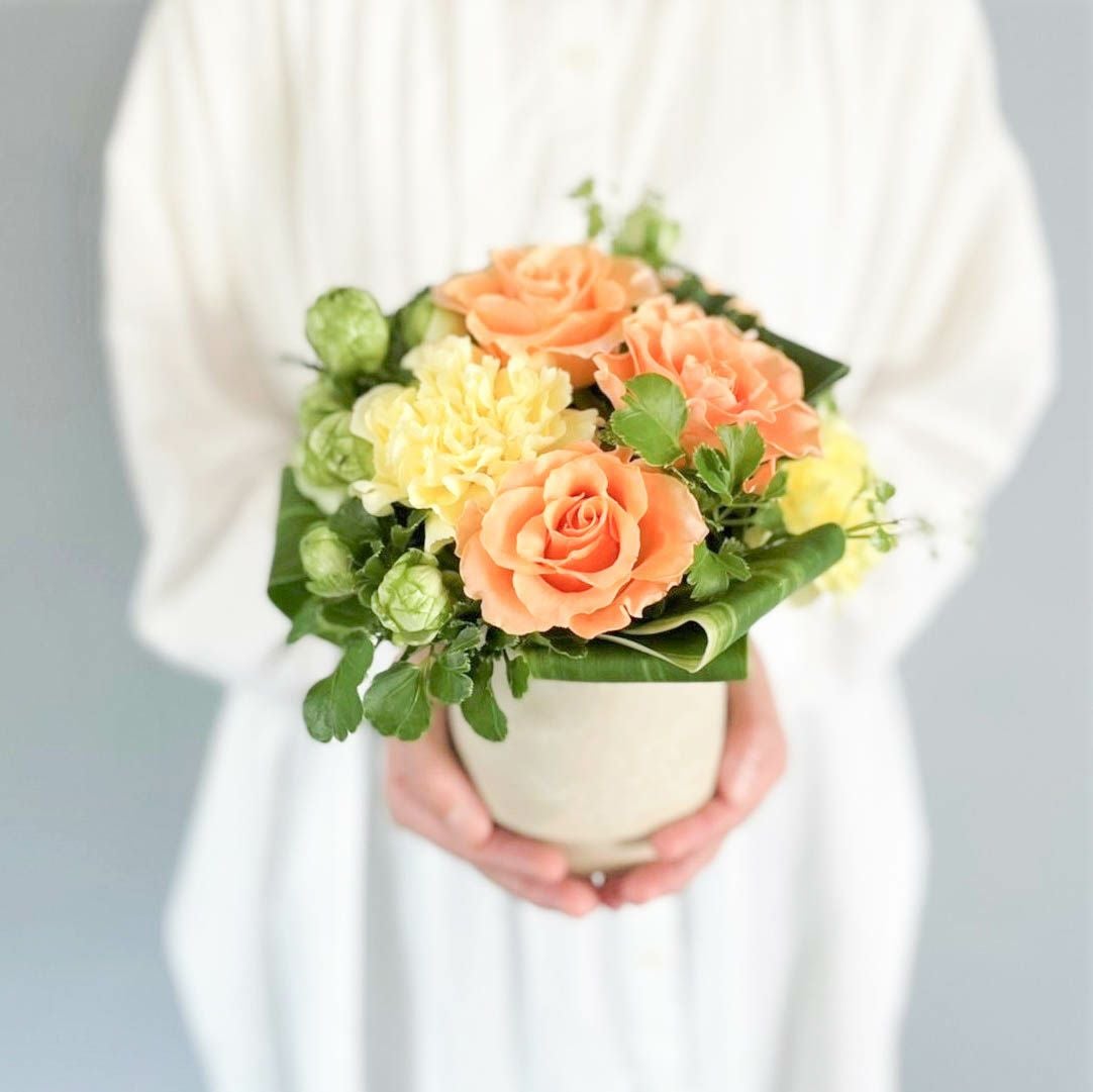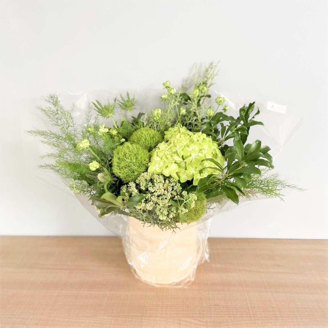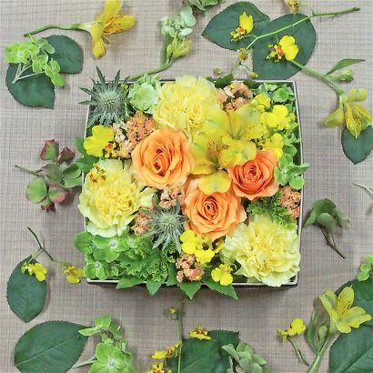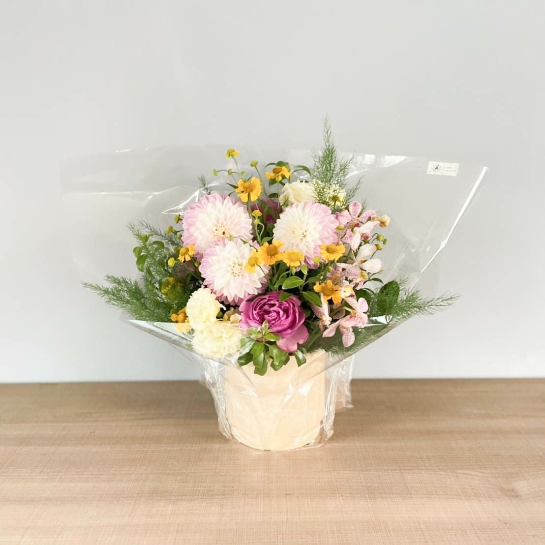 花束はラッピングしてお包みしたお花束を梱包しております。アレンジメントはセロハンで包装しております。ご到着の段ボールから取り出して、すぐにご利用頂ける状態になっております。