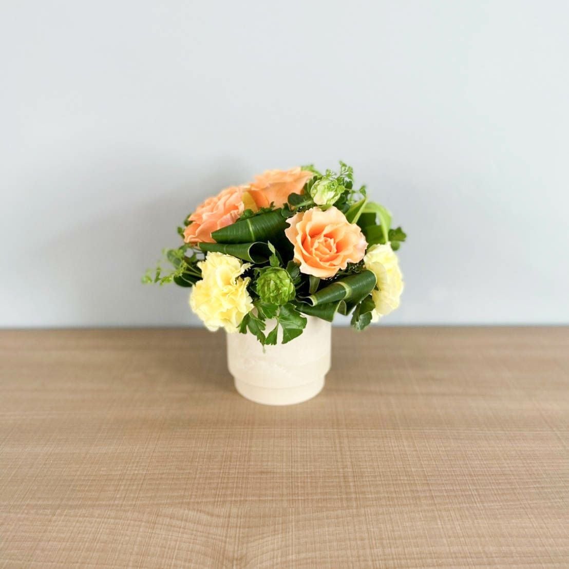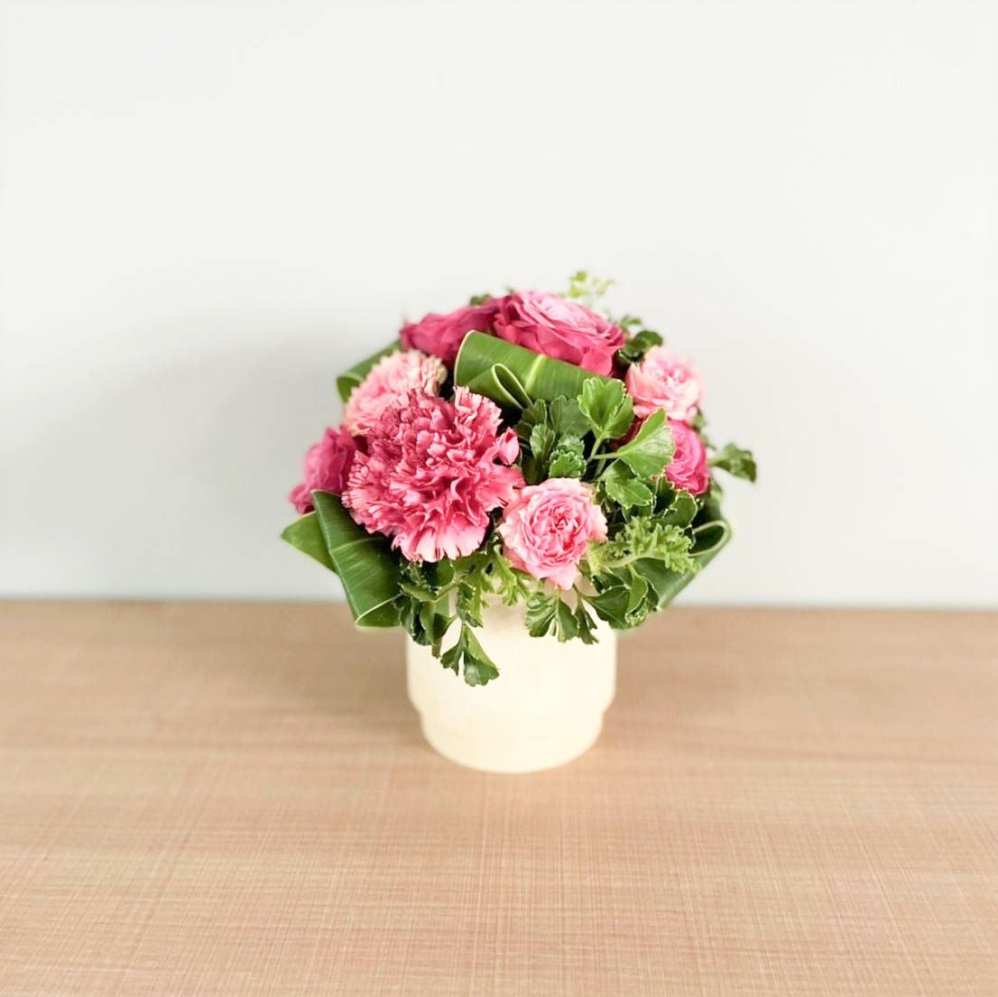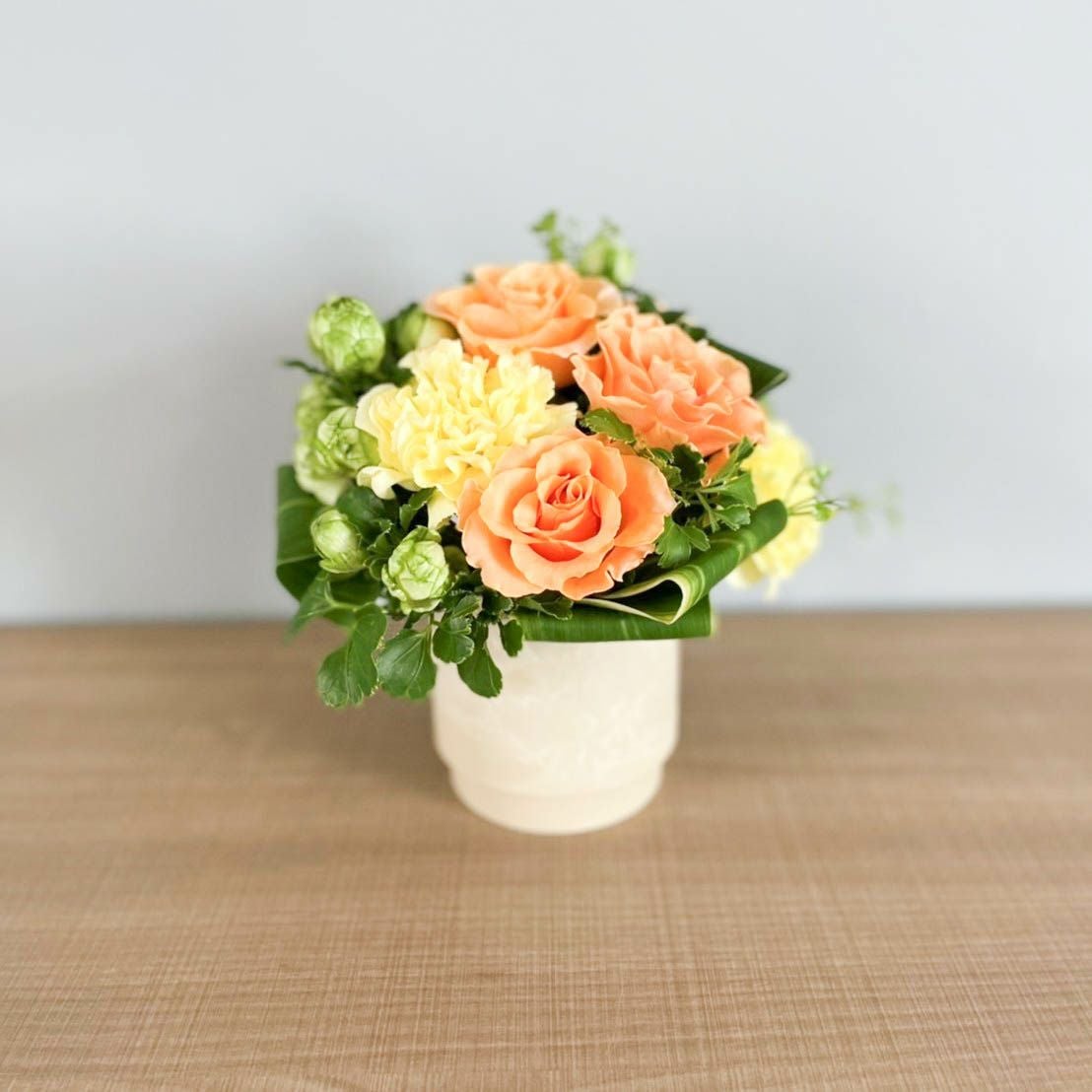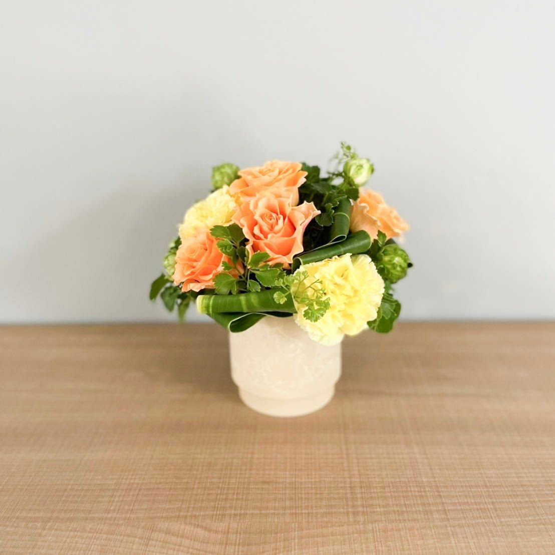 花束はラッピングしてお包みしたお花束を梱包しております。アレンジメントはセロハンで包装しております。ご到着の段ボールから取り出して、すぐにご利用頂ける状態になっております。