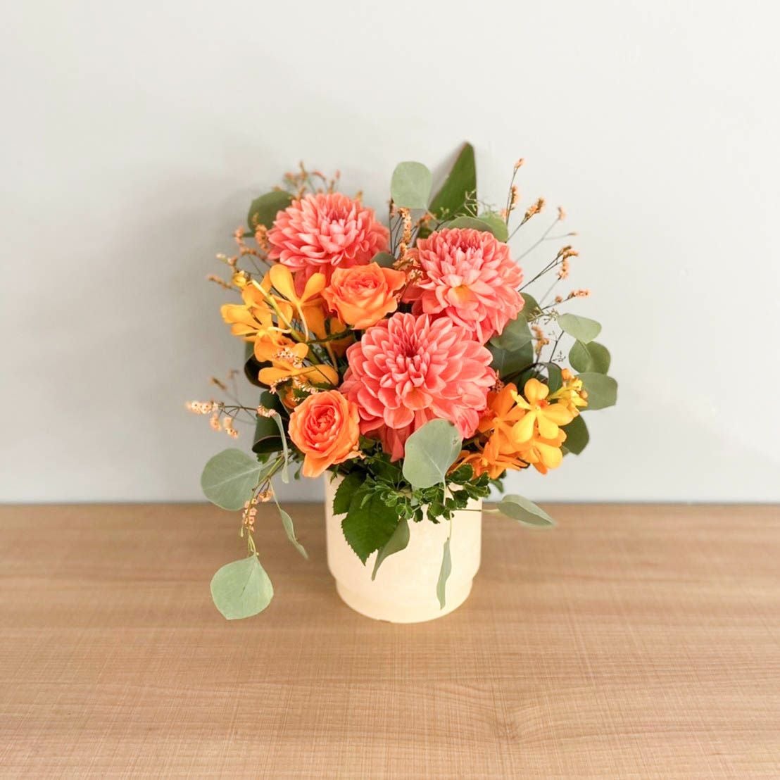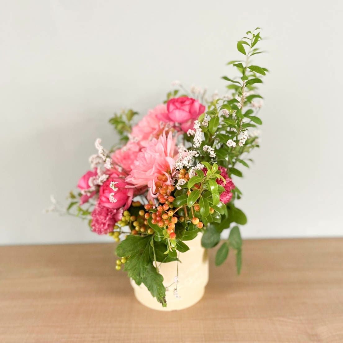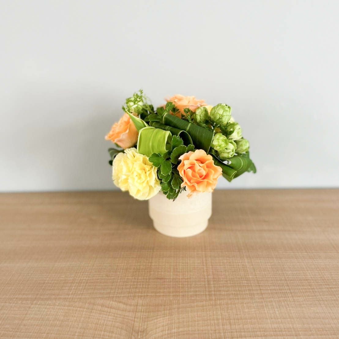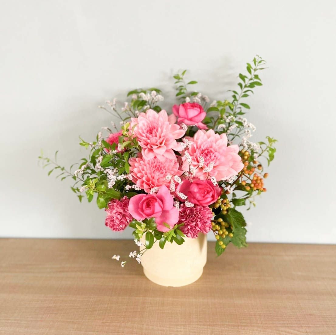 花束はラッピングしてお包みしたお花束を梱包しております。アレンジメントはセロハンで包装しております。ご到着の段ボールから取り出して、すぐにご利用頂ける状態になっております。