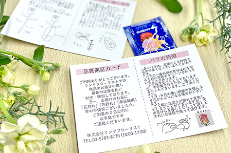 リンクフローリストでは、贈主様のお心のこもったお花のお届けに際し細心の注意を払い制作、梱包しております。 また、お届けした後も、お花をお楽しみ頂けるように、お手入れカードを商品に添えてお届けいたします。