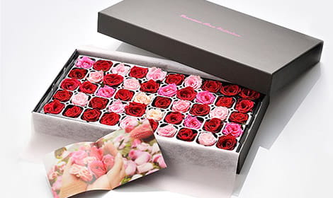 お風呂にきれいに浮かぶように咲き具合を調整したバラ。色あいは濃いレッド~濃いピンク~ピンクで華やかに。ボックスを開けた時によりきれいに見えるよう、バラをアレンジするように詰めています。ひとつずつ仕切りのあるケース収められたバラは、まるで高級なチョコレートやマカロンのよう。