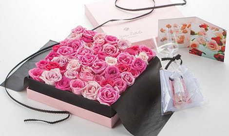 ピンクの薔薇でグラデーションされた運命のバラという名のローズファタール。まるでバラのアレンジメントの様なローズバス・フラワーボックスです。ピンクのバラ50輪以上でご用意致しました。